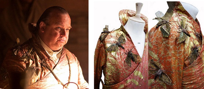 Исключение составляют, пожалуй, жители южного торгового города Кварт, костюмы которых, украшены разнообразными насекомыми. А также одежда Джоффри Ланистера, которая выделялась обилием золотой вышивки в виде львов и цветочного орнамента.